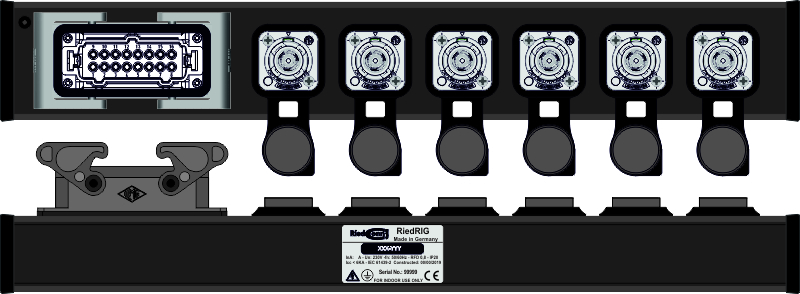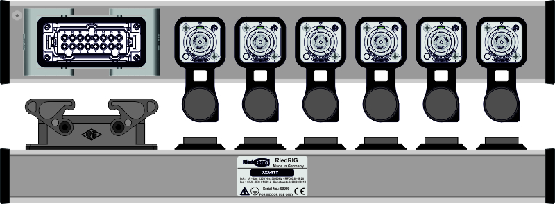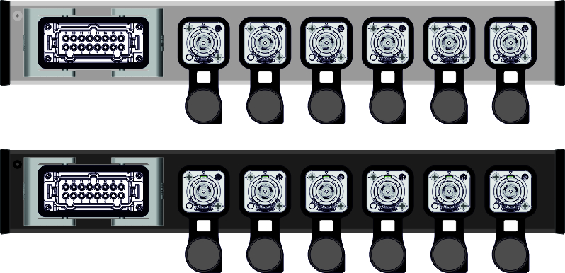 Stabiles Aluminiumgehäuse Natur oder schwarz eloxiert Schutzart IP44 / Für Innen- und Außeneinsatz geeignet + IN: Multipin HAN-E 16p. male mit 2 Bügel OUT: 6x Neutrik True1 female inkl. Dichtung, oben Sonstiges: integrierte Befestigungsnut für optionales Zubehör wie Kabelklett oder Halter für Schellen / Haken u.s.w.