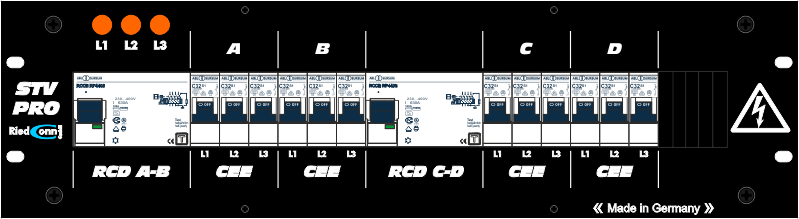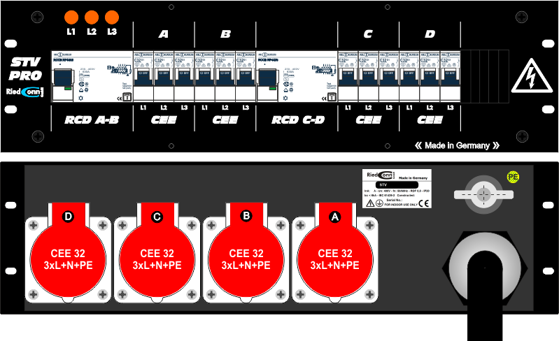 OUT: 4x Panel receptacles CEE32 400V, 5p. 6h